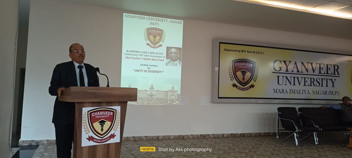 Guest lecture was conducted on Unity in Diversity to mark the 150th Birth Anniversary of Shri Sardar Vallabh Bhai Patel . The invited Speaker is Prof. G.L.Puntambekar, Retired Professor, Dr. Hari Singh Gour Vishwavidyalaya, Sagar. The faculties and students have taken pledge regarding the Integrity.