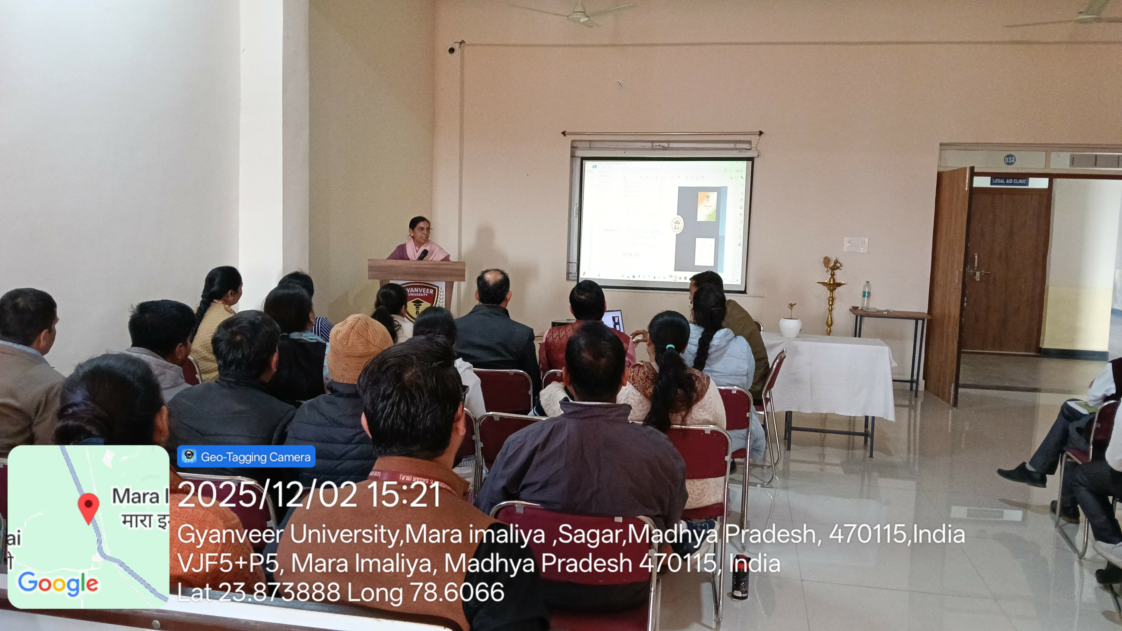 One Day workshop on NEP-2020 was organized in Gyanveer University on 2nd December 2025. the Guest Speaker for the Workshop is Prof. Imrana Siddhiqui, Professor, Department of Chemistry, Govt Arts & Commerce College Sagar. The workshop focuses on the entire structure of the NEP 2020 policy and the other information for students and faculties related to NEP 2020.