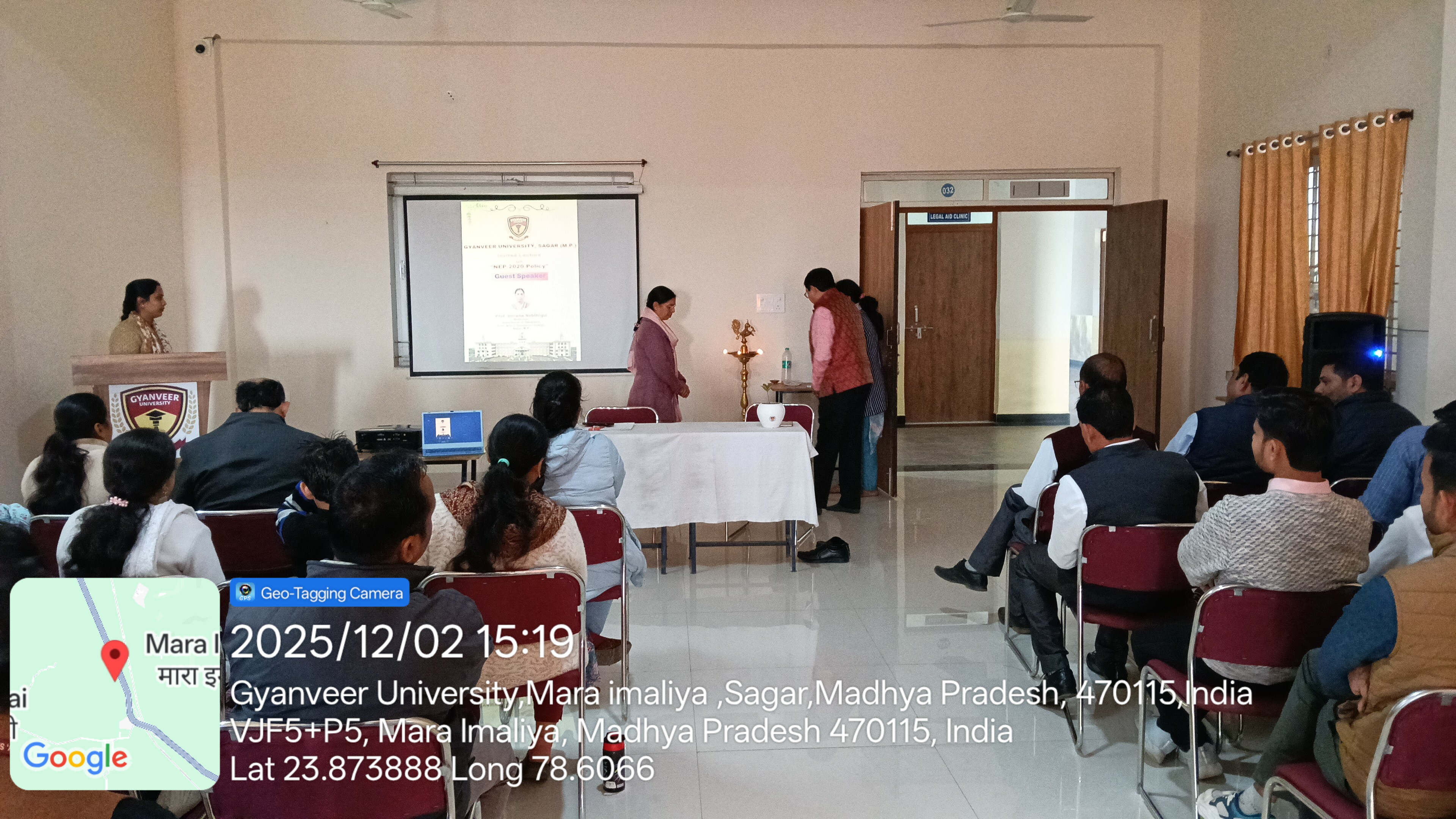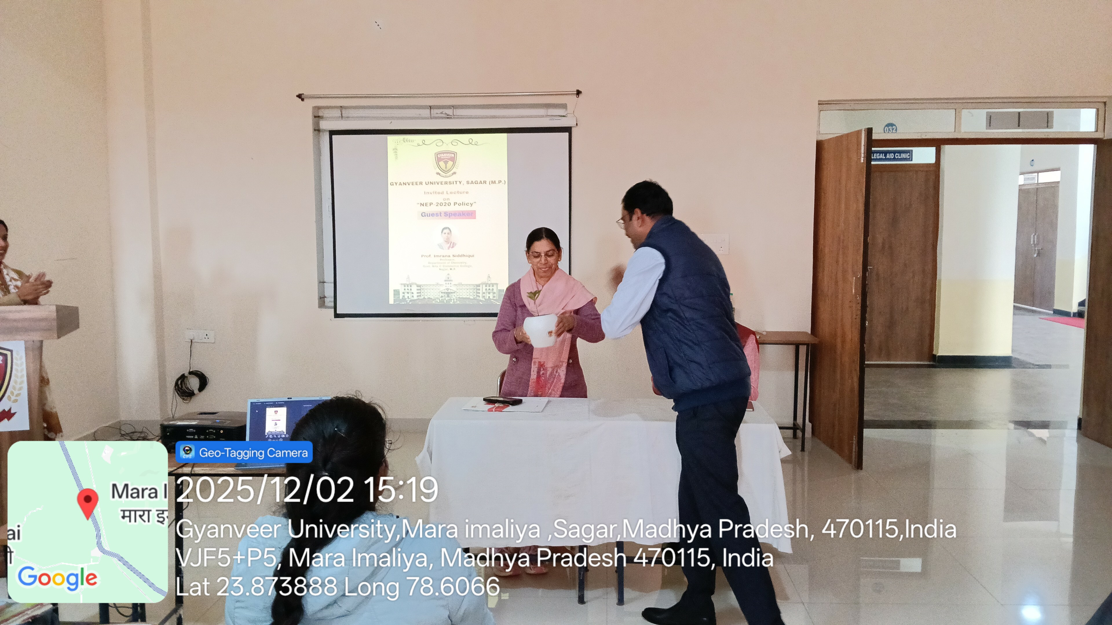 One Day workshop on NEP-2020 was organized in Gyanveer University on 2nd December 2025. the Guest Speaker for the Workshop is Prof. Imrana Siddhiqui, Professor, Department of Chemistry, Govt Arts & Commerce College Sagar. The workshop focuses on the entire structure of the NEP 2020 policy and the other information for students and faculties related to NEP 2020.