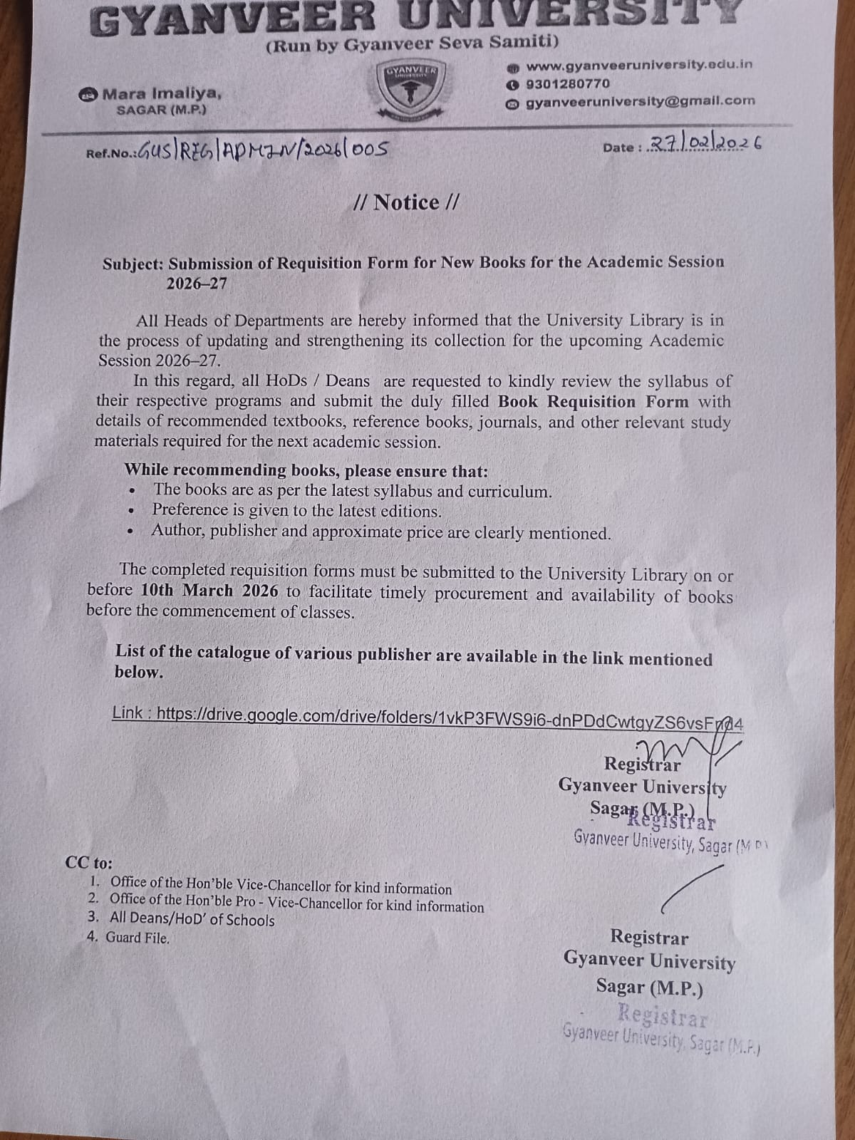 Notice for All HODs/ Dean to filled and submit the BOOK REQUISTION FORM before 10th March 2026