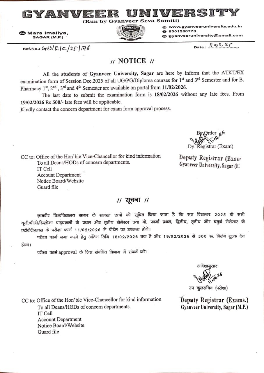 Last date to submit examination form is 18/02/2026 for UG/PG/Diploma first & third semester for the examination session Dec-2025
