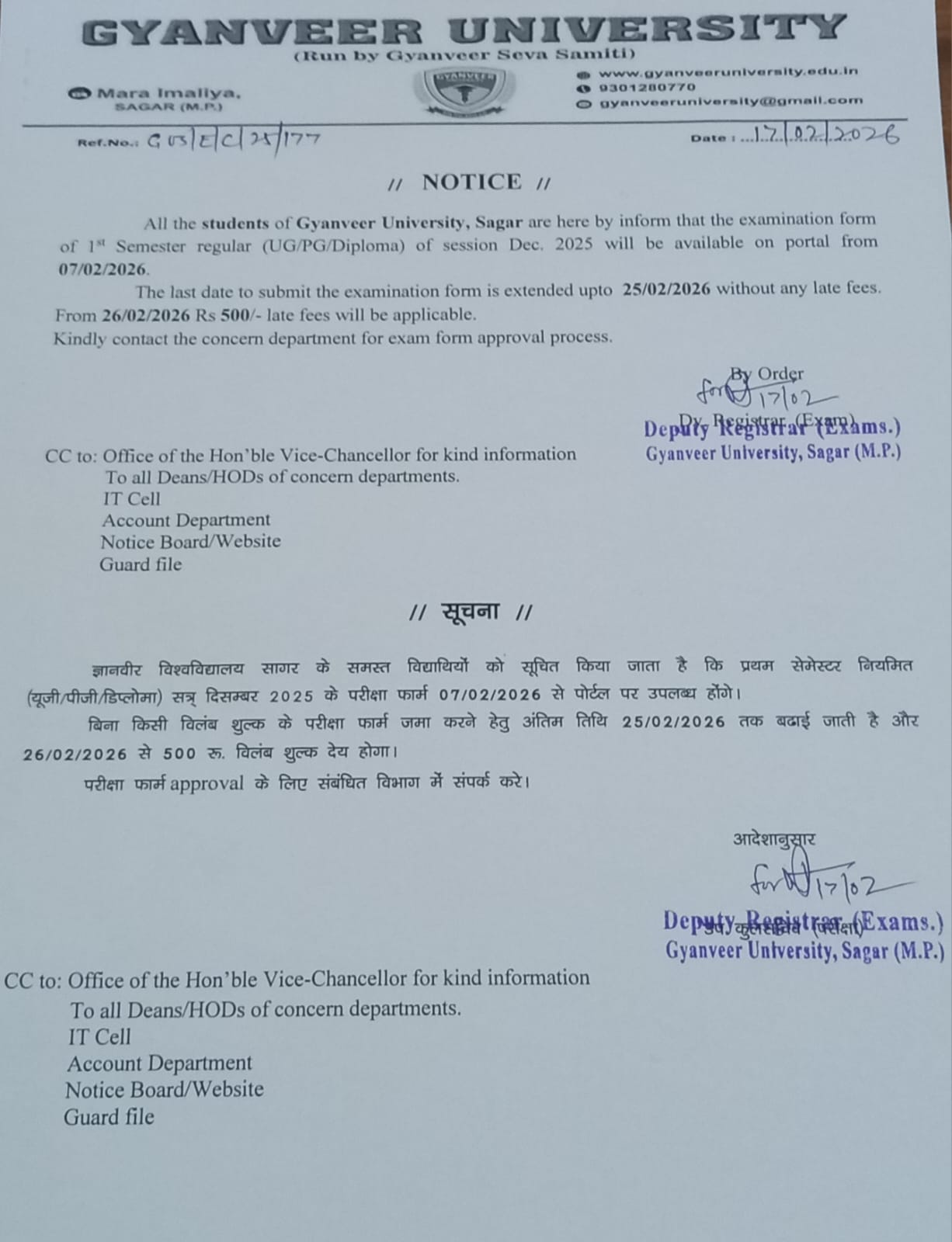 Exam form date extended upto 25-02-2026 without any late fees for the examination session Dec-2025